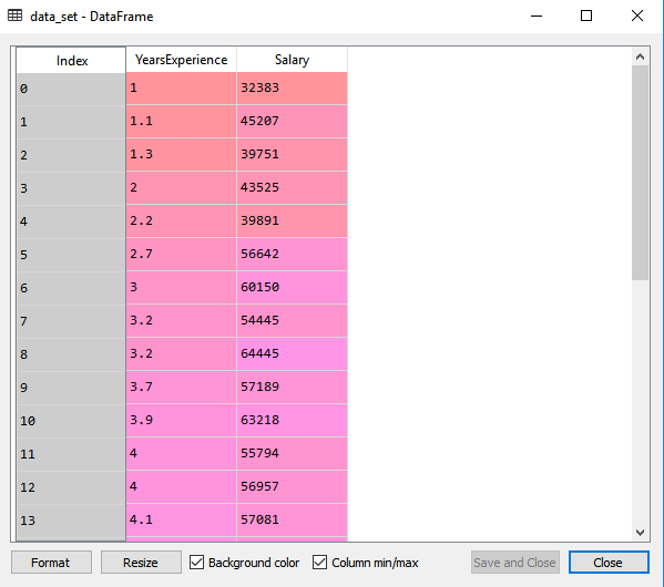 上面的输出显示了数据集,它有两个变量:工资和经验。
