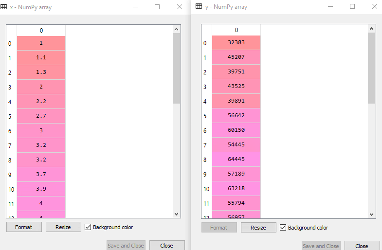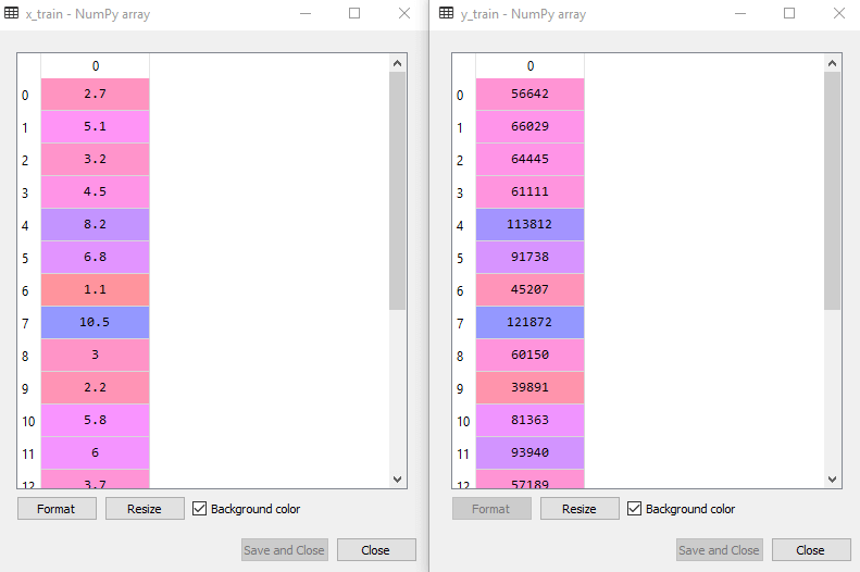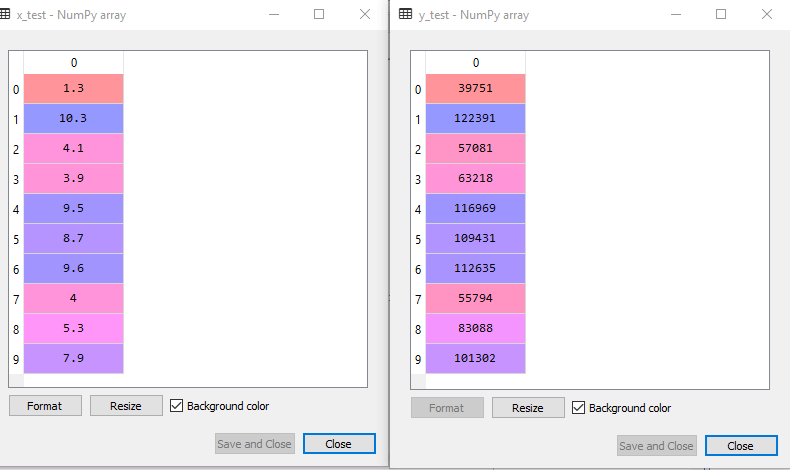 在执行上述代码行时,将在变量资源管理器选项中生成两个变量y_pred和x_pred,其中包含训练集和测试集的薪资预测。