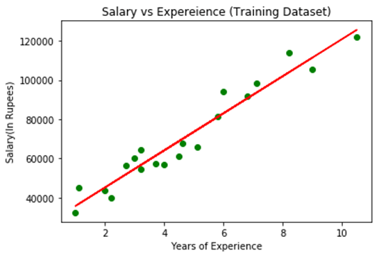 接下来,我们将给予图表一个标题的。所以在这里,我们将使用pyplot库的title()函数,名称为“Salary vs Experience (Training Dataset)”。