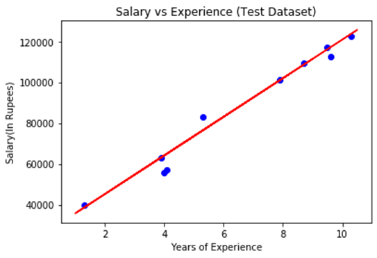 因变量(工资)和自变量(经验)。现在,我们的模型已经准备好预测新的观测结果。在这个步骤中,我们将向模型提供测试数据集(新的观察结果),以检查它是否能够预测正确的输出。