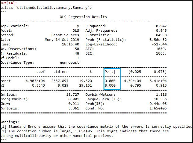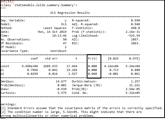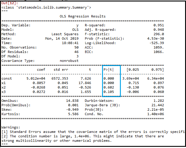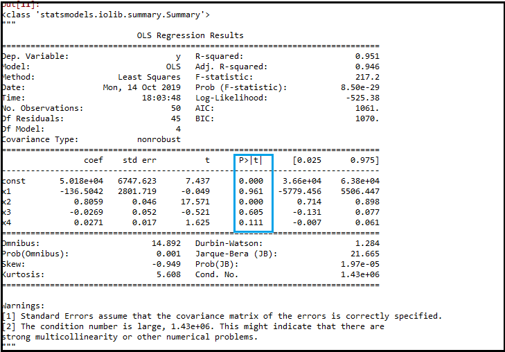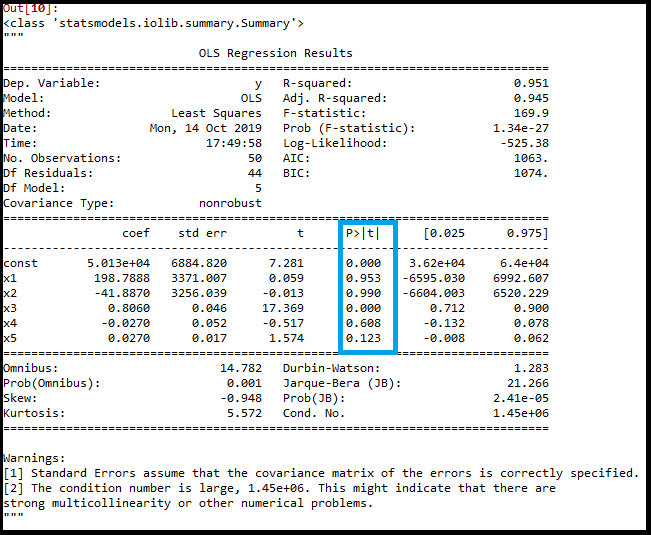 在上图中,我们可以清楚地看到所有变量的p值。这里x1, x2是虚拟变量,x3是研发支出,x4是管理支出,x5是营销支出。
