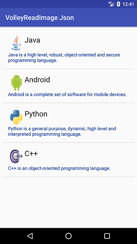 在此示例中,我们将使用Volley库从URL加载JSON数据。 JSON数据包含教程的字符串“名称”,字符串“ imageurl”和字符串“ description”。从URL提取数据后,它们将显示在ListView中。你可以在https://www.srcmini05.com/android-json-parsing-tutorial上参考有关JSON解析教程的更多信息。