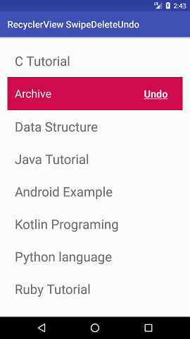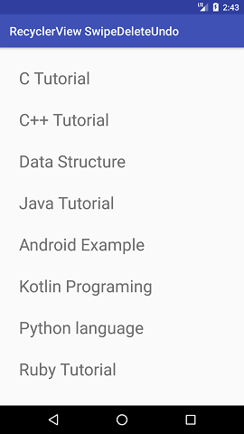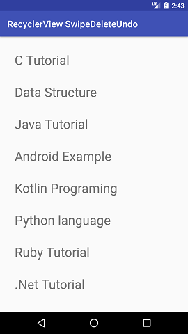 在本教程中,我们将创建示例以通过使用撤消功能滑动项目来删除RecyclerView的项目。为此,我们将使用Android支持库V7中添加的ItemTouchHelper类。此类用于创建滑动以删除RecyclerView的项目。它具有SimpleCallback类,该类配置了为滑动或移动RecyclerView的项目而执行的事件。