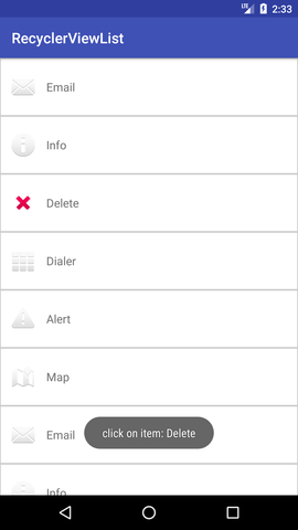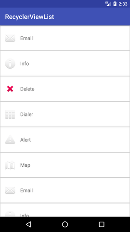在本教程中,我们将使用RecyclerView使用ImageView(用于图标)和TextView(用于描述)创建项目列表,并对列表项执行点击侦听器。