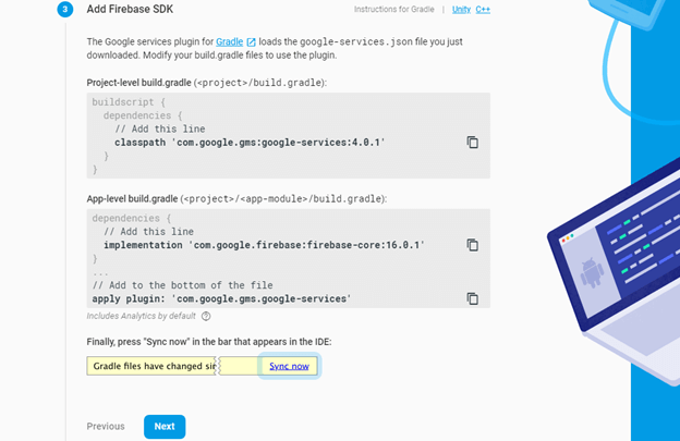 8.在应用程序的.gradle文件中添加firebase SDK依赖项,然后在IDE中单击“立即同步”,然后单击“下一步”。