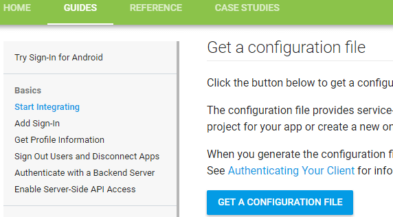 1.通过https://developers.google.com/identity/sign-in/android/start-integrating创建一个Google开发者帐户,然后点击“获取配置文件”。