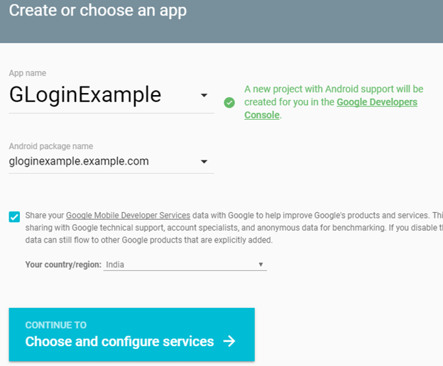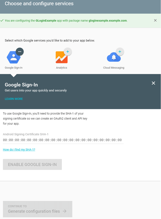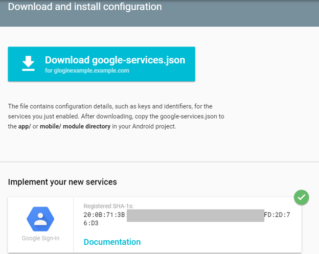 要将Google Sign-In API集成到我们的应用中,我们需要将我们的应用配置为Google开发者帐户,并为Android应用下载“ google-service.json”文件。