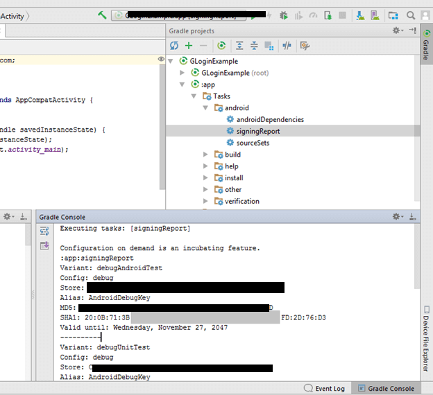 - 由Android Studio本身提供。打开Android项目。从右侧面板打开“ Gradle”选项卡。双击“ signingReport”。我们将在“ Gradle Console”上找到我们的应用SHA-1键。
