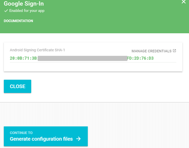 6.将生成的SHA-1密钥粘贴到Google登录服务,然后单击“启用GOOGLE登录”和“生成认证文件”。
