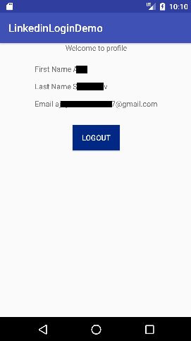 在APIHelper类的getRequest()方法中添加LinkedIn API URL https://api.linkedin.com/v1/people/~:(id,名字,姓氏,电子邮件地址)。它将获取有关LinkedIn API成功的用户信息。