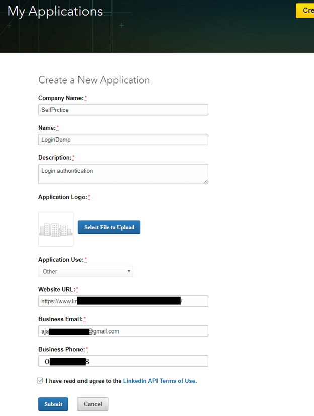2.在“创建新应用程序”表单中填写Android应用程序的所有必需详细信息,并接受LinkedIn API使用条款,然后单击“提交”。