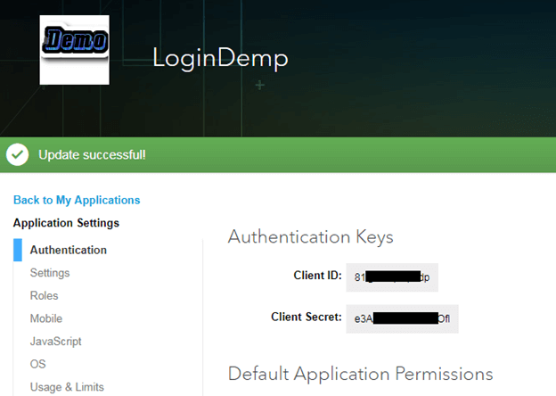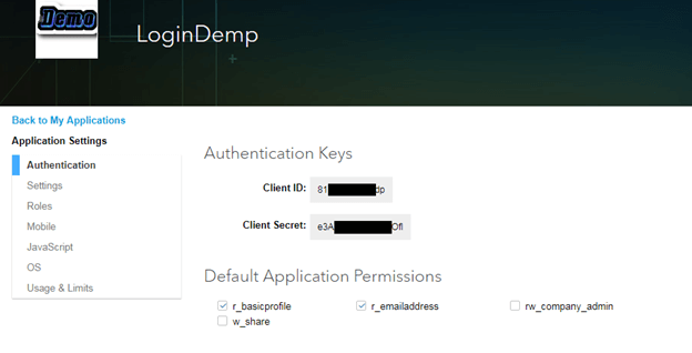 3.提交应用程序详细信息后,它将生成LinkedIn身份验证密钥。现在,我们将选择“默认应用程序权限”。该权限授权访问用户帐户的权限。在这里,我们选择r_basicprofile和“ r_emailaddress”,然后单击“更新”。