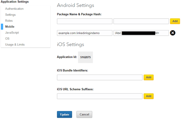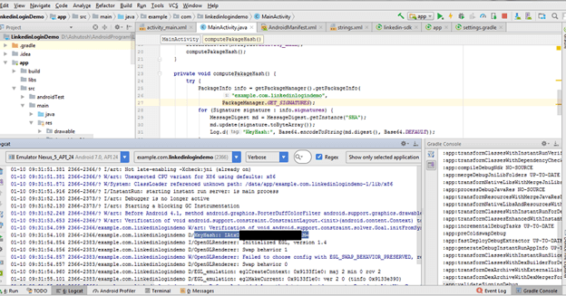 5.从Logcat复制“哈希密钥”,并将其粘贴到我们的LinkedIn应用程序的“移动”选项卡中。之后,单击“添加”和“更新”。这使我们的应用程序“哈希键”已在LinkedIn API中注册。