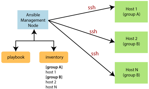 在上图中,管理节点是控制剧本整个执行的控制节点。清单文件提供了需要运行Ansible模块的主机列表。管理节点建立SSH连接,并在主机计算机上执行小模块并安装软件。