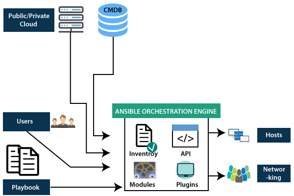 Ansible编排引擎与正在编写Ansible剧本的用户进行交互,以执行Ansible编排,并与私有或公共云服务以及配置管理数据库进行交互。你可以在下图中显示,例如: