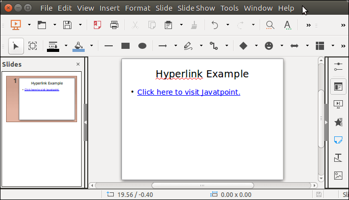要在Powerpoint中设置超链接,Apache POI提供了createHyperlink()方法,该方法负责在幻灯片上创建链接。请参见以下示例,我们将在Powerpoint中演示使用Java程序的超链接实现。