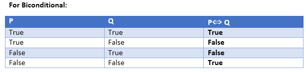 在命题逻辑中,我们需要了解所有可能情况下命题的真值。我们可以将所有可能的组合与逻辑连接词组合在一起,这些组合以表格格式的表示称为真值表。以下是所有逻辑连接词的真值表: