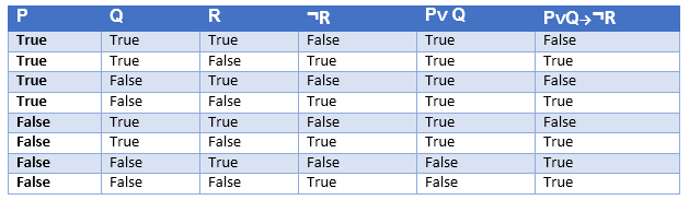 我们可以构建一个由三个命题P,Q和R构成的命题。由于我们采用了三个命题符号,因此该真值表由8n元组组成。