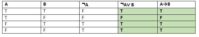 让我们采用两个命题A和B,因此对于逻辑上的等价关系,我们可以将其写为A⇔B。在下面的真值表中,我们可以看到¬A∨B和A→B的列相同,因此A等于B
