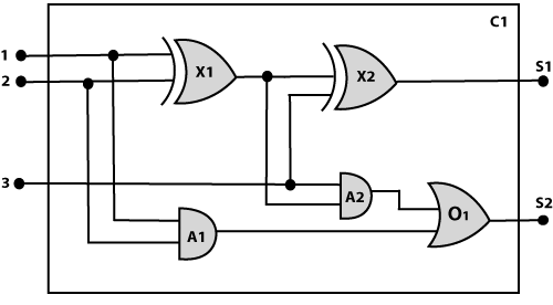 由于电路中有两个XOR,两个AND和一个OR门,因此这些门的原子语句为: