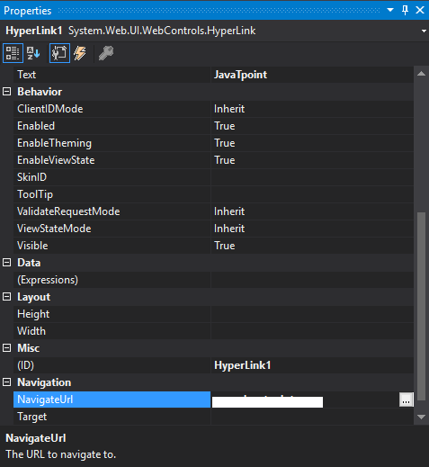要创建HyperLink,我们可以编写代码或使用Visual Studio IDE的拖放功能。该控件在工具箱中列出。