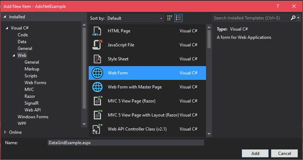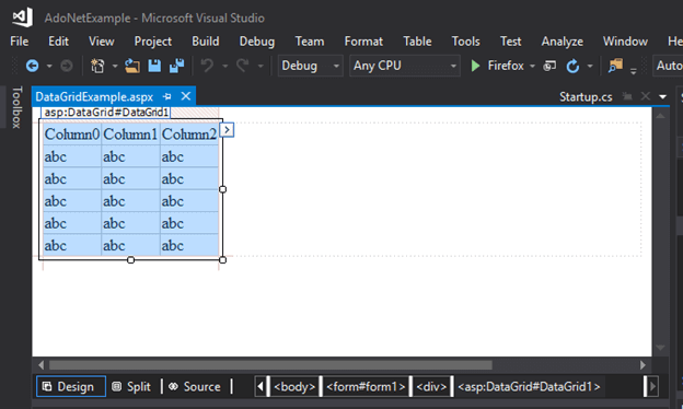 它是服务器端控件,可以从工具箱拖动到Web表单。 DataGrid的数据源可以是DataTable或数据库。让我们看一个示例,如何在应用程序中创建一个DataGrid。