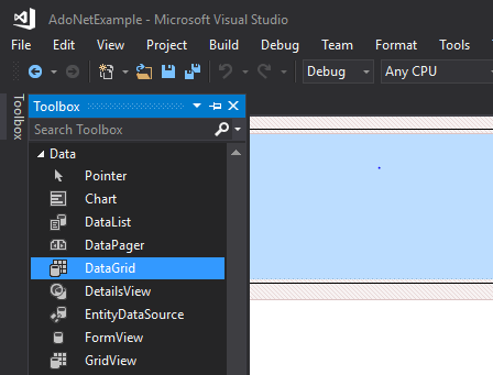 现在添加后,打开工具箱并将DataGrid控件拖到窗体。