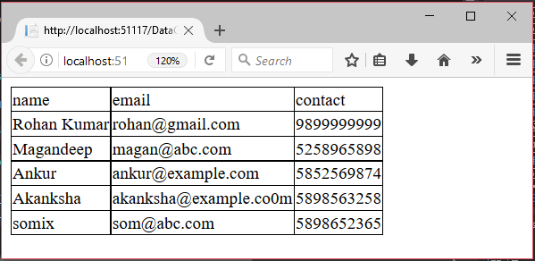执行此应用程序后,它将从SQL Server获取记录并显示到Web浏览器。