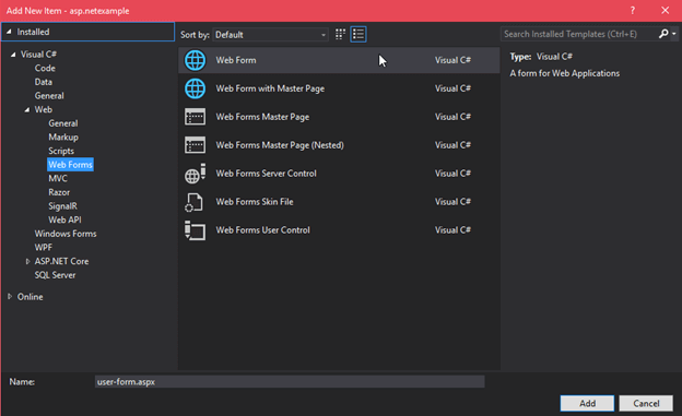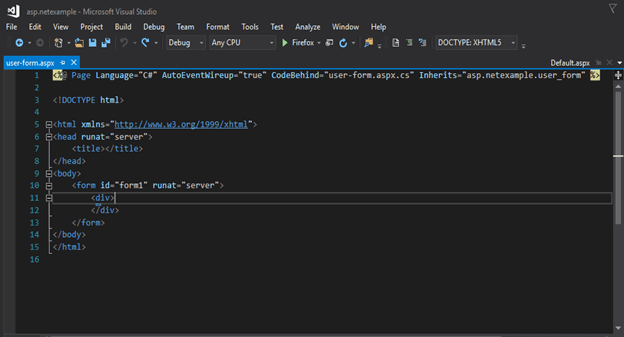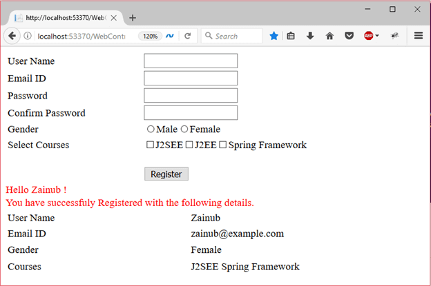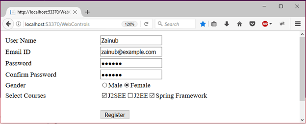 在代码隐藏文件中,我们添加了一条消息,它只在用户提交注册表单时触发。该文件包含以下代码。