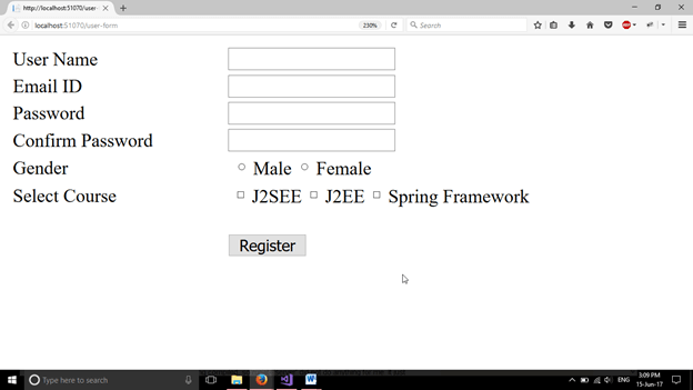在学习了web服务器控件之后,现在让我们创建一个用户注册表单。此web表单接受用户输入并提交给服务器。提交后,返回注册成功的消息。整个过程包括以下步骤。