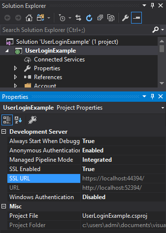 在解决方案资源管理器中,单击项目并按F4显示属性窗口。现在,将SSL Enable属性更改为true。