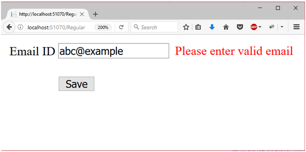它将验证我们在正则表达式中指定的电子邮件格式。如果验证失败,则会引发错误消息。