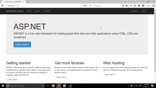 在本主题中,我们使用Visual Studio 2017 IDE创建MVC Web应用程序。它包括下面给出的各个步骤。以下这些步骤说明了如何创建基于MVC的Web应用程序。