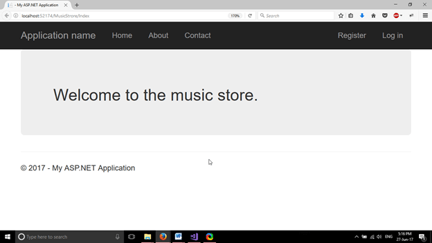 为了使用浏览器访问此控制器,我们将一个索引文件添加到view文件夹内的MusicStore文件夹中。该索引文件包含以下代码。