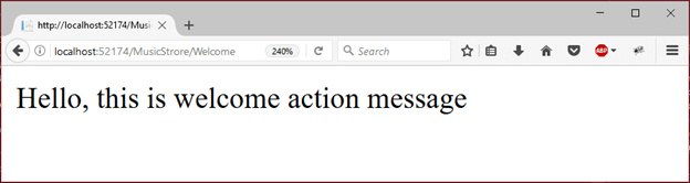 要访问欢迎操作方法,请执行该应用程序,然后使用MusicStore / Welcome URL对其进行访问。它将产生以下输出。