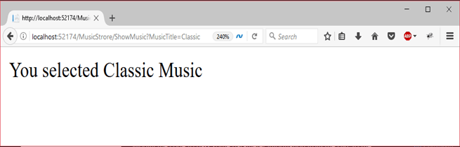 在URL中,我们必须传递参数值。因此,我们通过此URL localhost:port-no / MusicStore / ShowMusic?MusicTitle = Classic执行此操作。它产生以下结果。