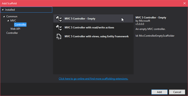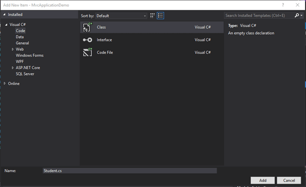 创建模型后,现在让我们为该类创建一个控制器。右键单击Controller文件夹,然后添加控制器类。