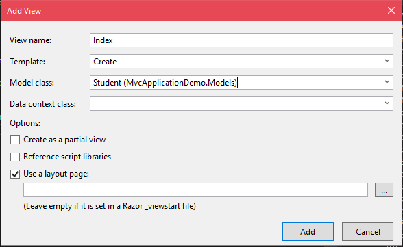 要创建视图,请在“索引”操作方法的主体内单击鼠标右键,然后选择“添加视图”选项,将弹出该视图的名称,并将模型附加到该视图中。