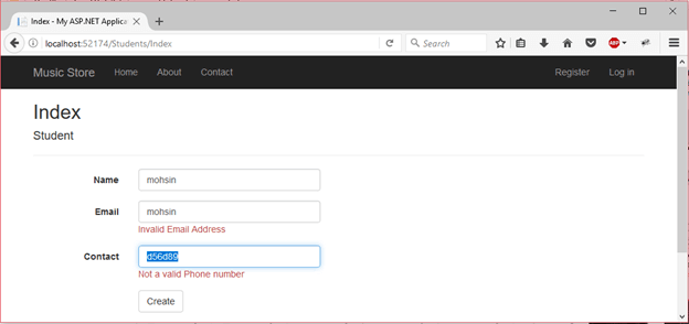 如我们所见,它验证表单字段并向用户显示错误消息。在下面的屏幕截图中,我们正在验证输入的数据是否符合预期。