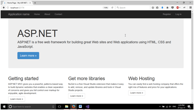根据此安装文件,将Home控制器的Index操作视为默认操作。第一次,当应用程序运行时,它将产生以下输出。