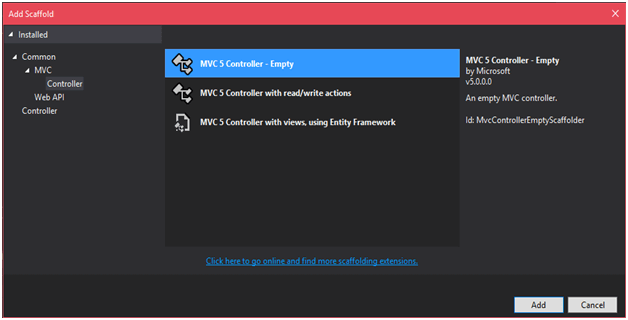 现在,让我们创建一个新的控制器并将其配置为路由文件。右键单击Controller文件夹,然后选择添加,然后选择控制器。它将弹出一个窗口。选择一个空的控制器,就像我们在屏幕截图中所做的那样。