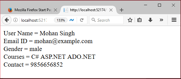 "Email ID  = " + Request.Form["email"] + "<br/>" +
