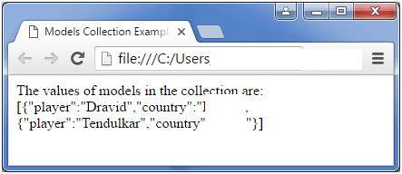 document.write("The values of models in the collection are: "+JSON.stringify(myval.models));