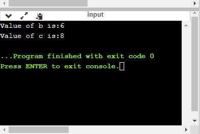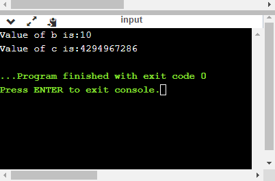 在上面的程序中,我们使用无符号格式说明符来显示b和c的值,即% u。b的值是正的,所以%u指定符打印b的确切值,但它不打印c的值,因为c包含负的值。