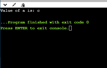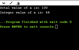 在上面的代码中,y包含十六进制值“A”。我们以两种格式显示y的十六进制值。我们使用%x和%x来打印十六进制值,其中%x以小写字母显示值,即, ‘a’和%X用大写字母表示,即“A”。