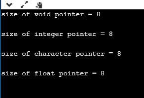 C中的void指针的大小与字符类型的指针的大小相同。根据C感知,指向void的指针的表示形式与字符类型的指针相同。指针的大小将根据所使用的平台而有所不同。