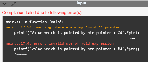上面的代码显示了“无效使用void表达式”的编译时错误,因为我们不能直接对void指针应用算术运算,即ptr = ptr 1。