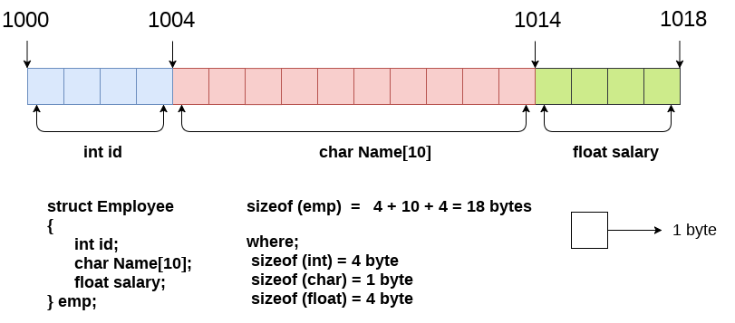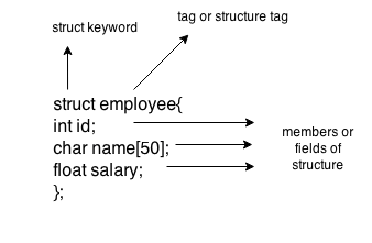在这里,struct是关键字;员工是结构的名称; id,名称和薪水是结构的成员或字段。让我们通过下面的图表来理解它: